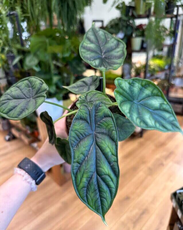 Water your Alocasia when the top couple of inches of soil feel dry to the touch. Be careful not to overwater, as its roots don’t like to sit in moisture. Less is more when it comes to hydrating this plant.