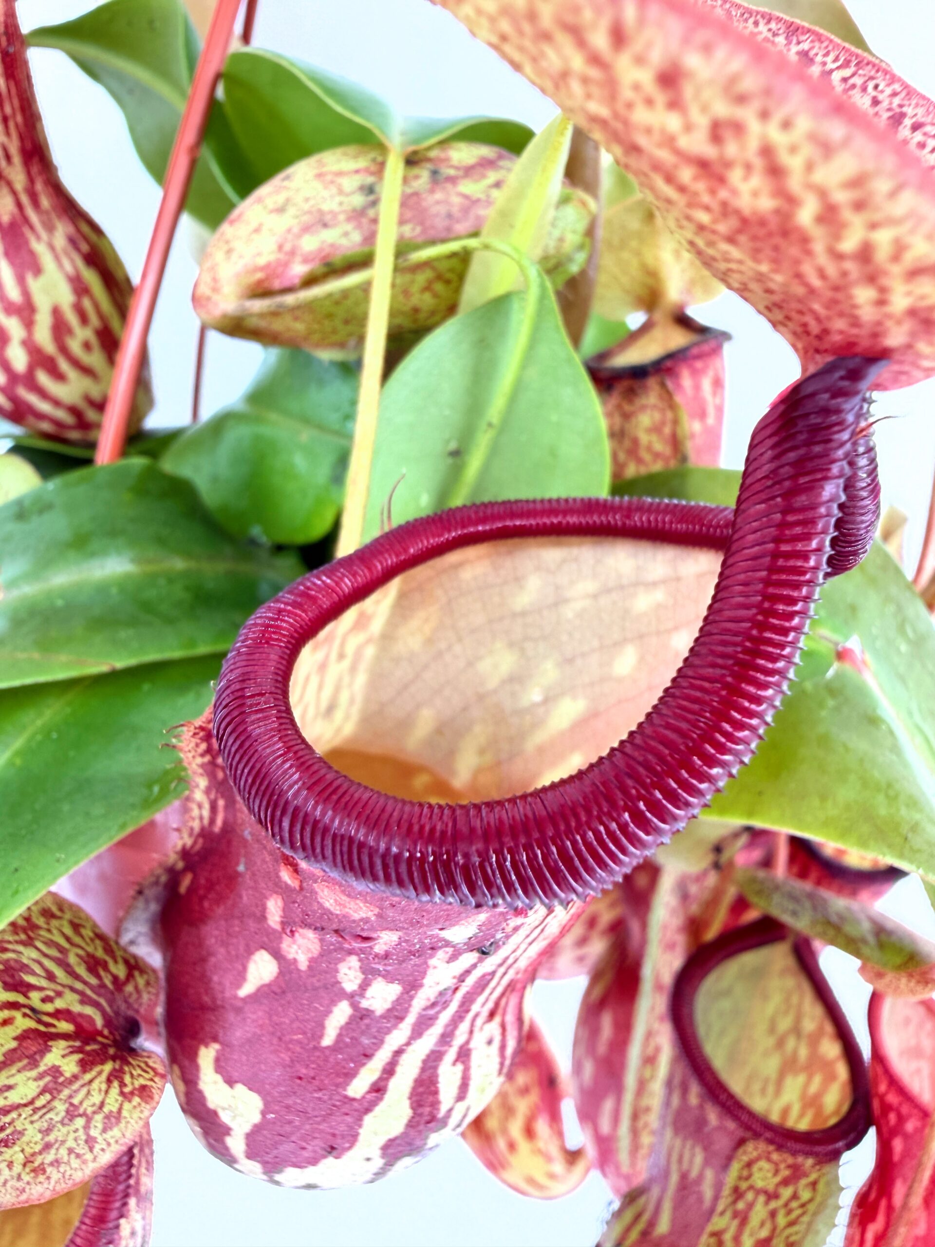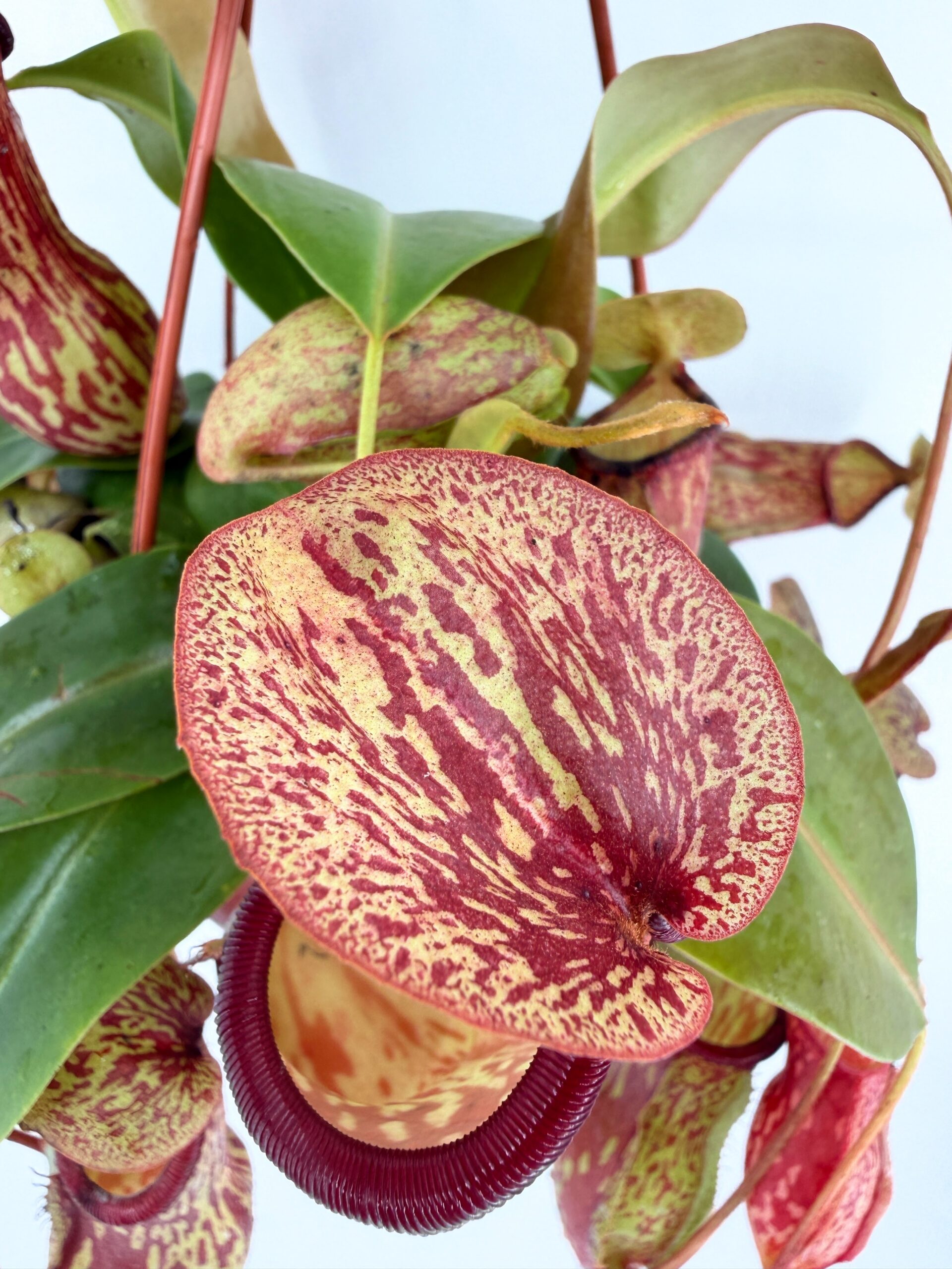 Produces hanging pitcher traps that develop from the ends of its leaves, creating a trailing or climbing effect over time.
