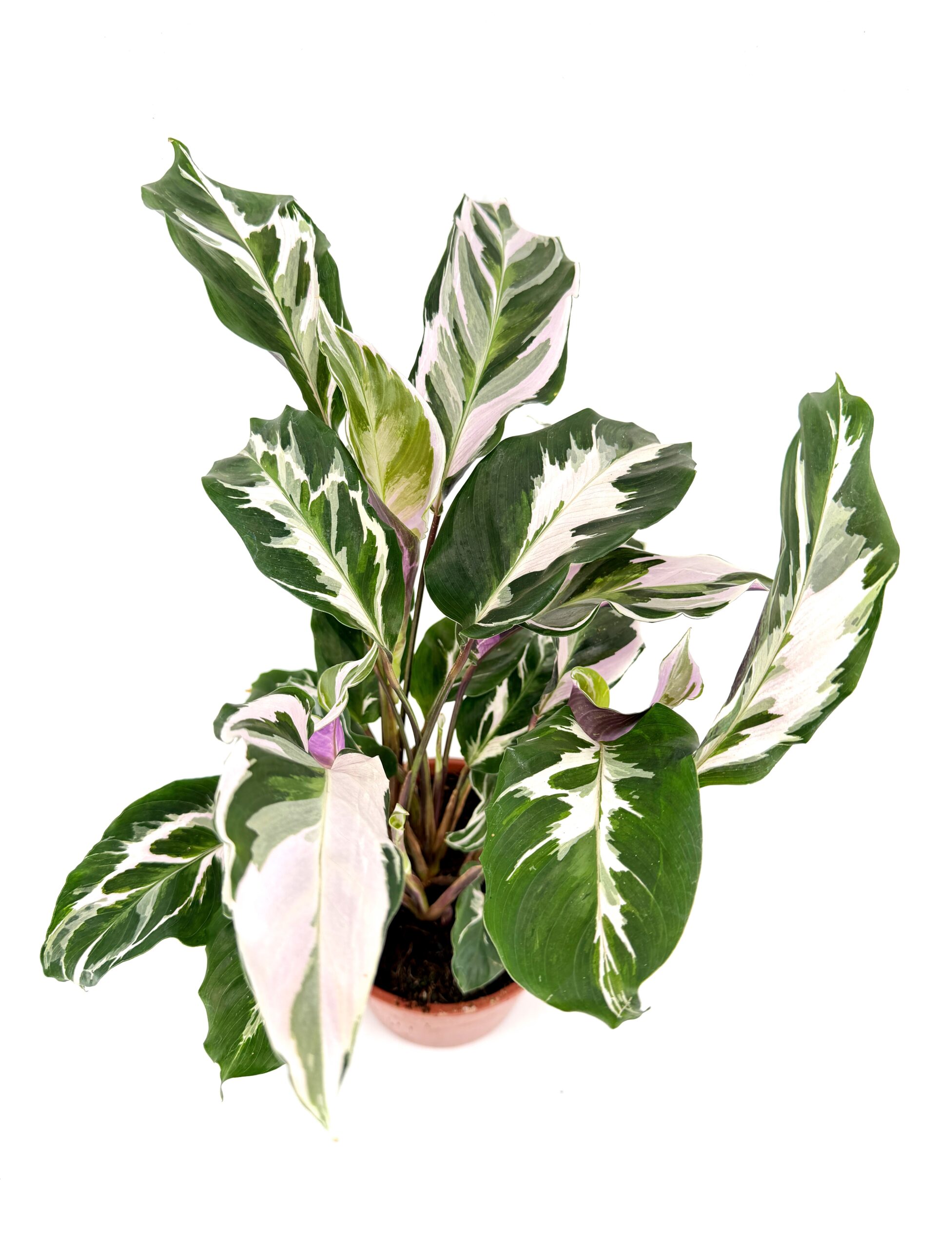 The Calathea White Fusion is one of the most eye-catching variegated houseplants available. Its beautifully patterned leaves display swirling shades of white, soft green and subtle lilac undersides, creating a living piece of artwork that changes throughout the day.
