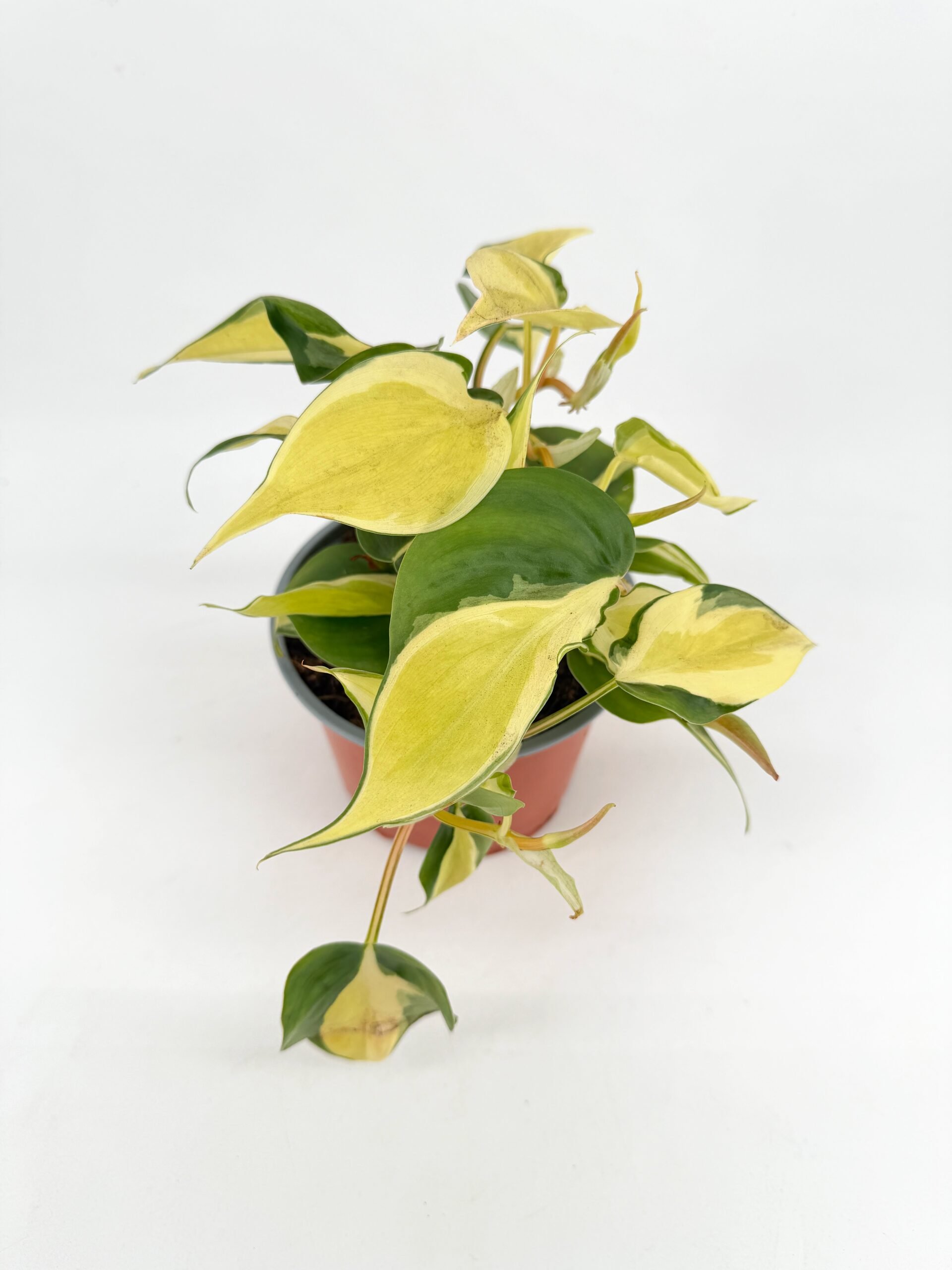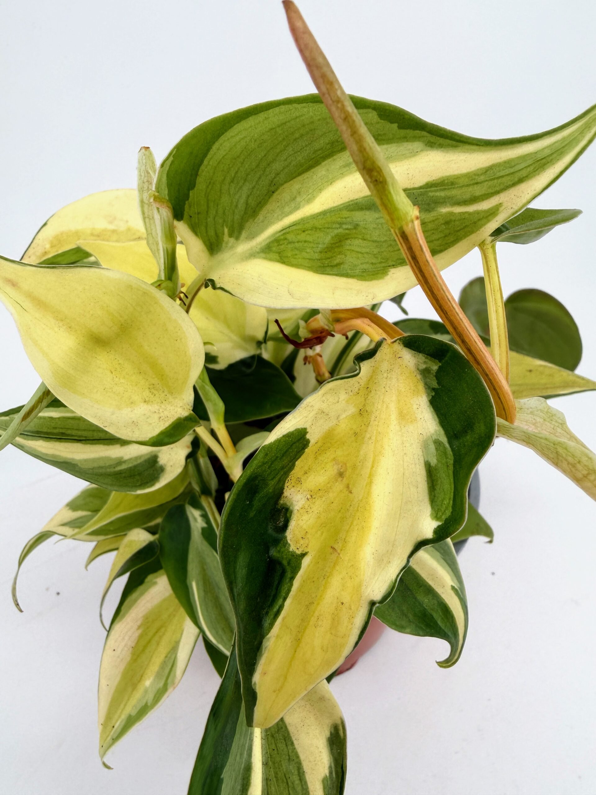 Philodendron Rio is a beautiful variegated trailing plant with glossy, heart shaped leaves patterned in soft greens with creamy stripes. It is ideal for shelves, hanging pots, or training up a small moss pole. It suits beginners and experienced growers, and with bright indirect light it keeps strong variegation and grows steadily.