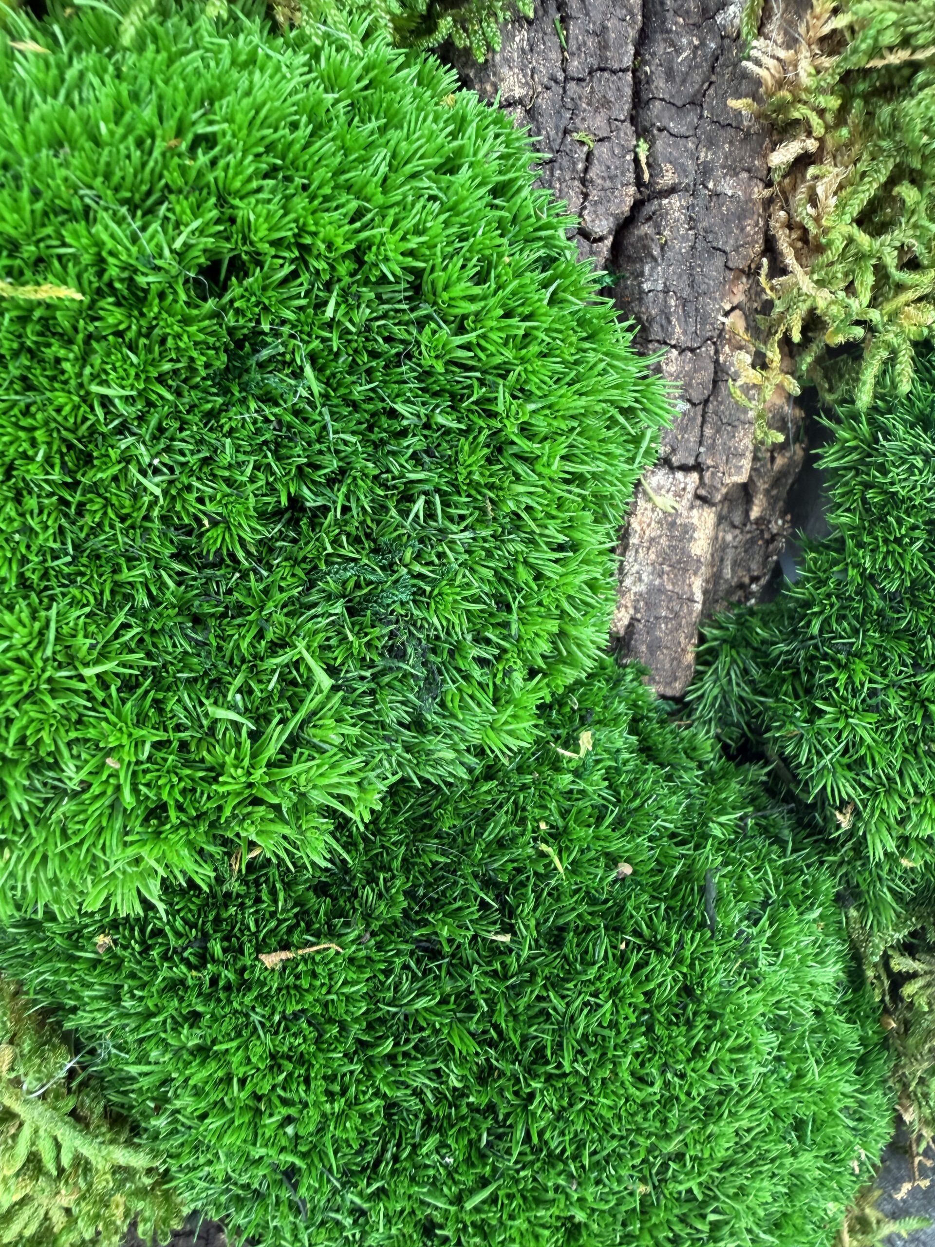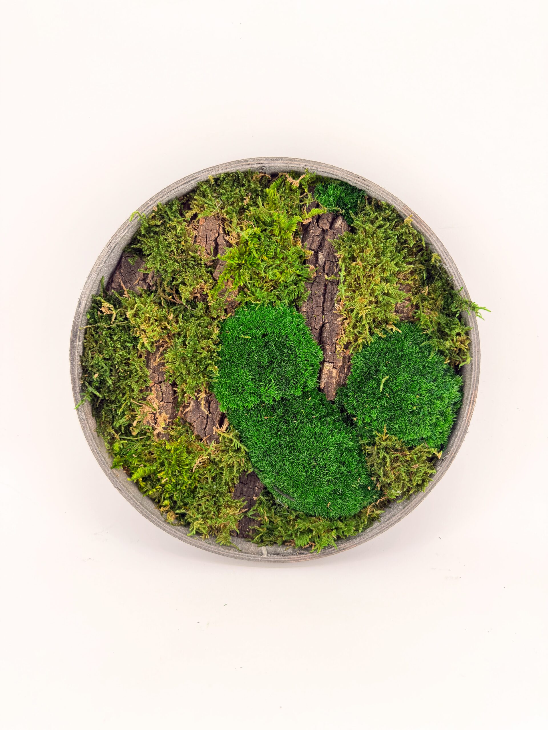 This circular piece measures around 30cm in diameter and is created using naturally preserved moss in rich green tones, layered over textured bark to give a realistic forest look. Every piece in this series is handmade and one of a kind, with its own natural shapes and patterns. The recycled frame gives it a rustic finish, making it perfect for modern homes, creative spaces and nature themed interiors.