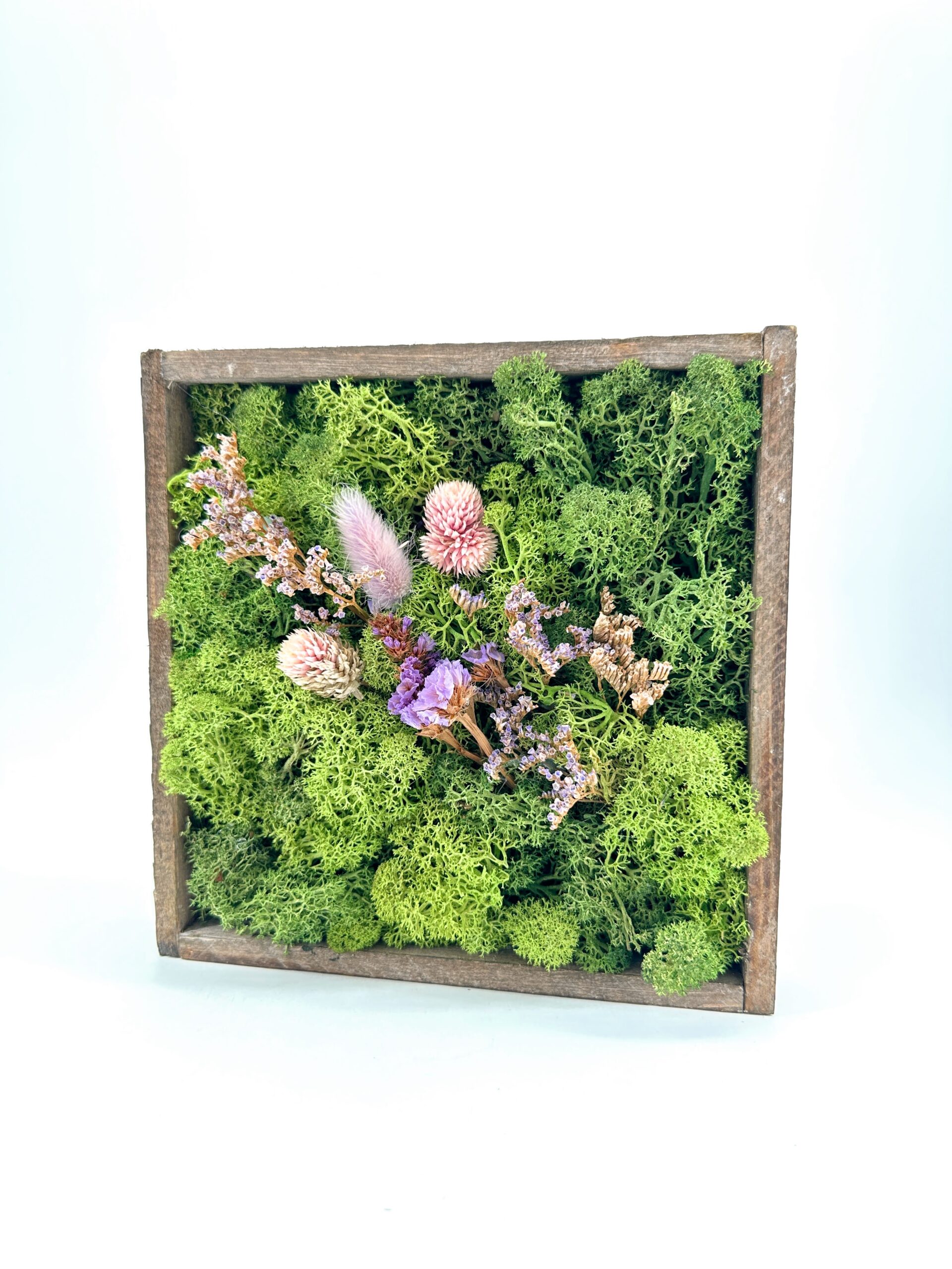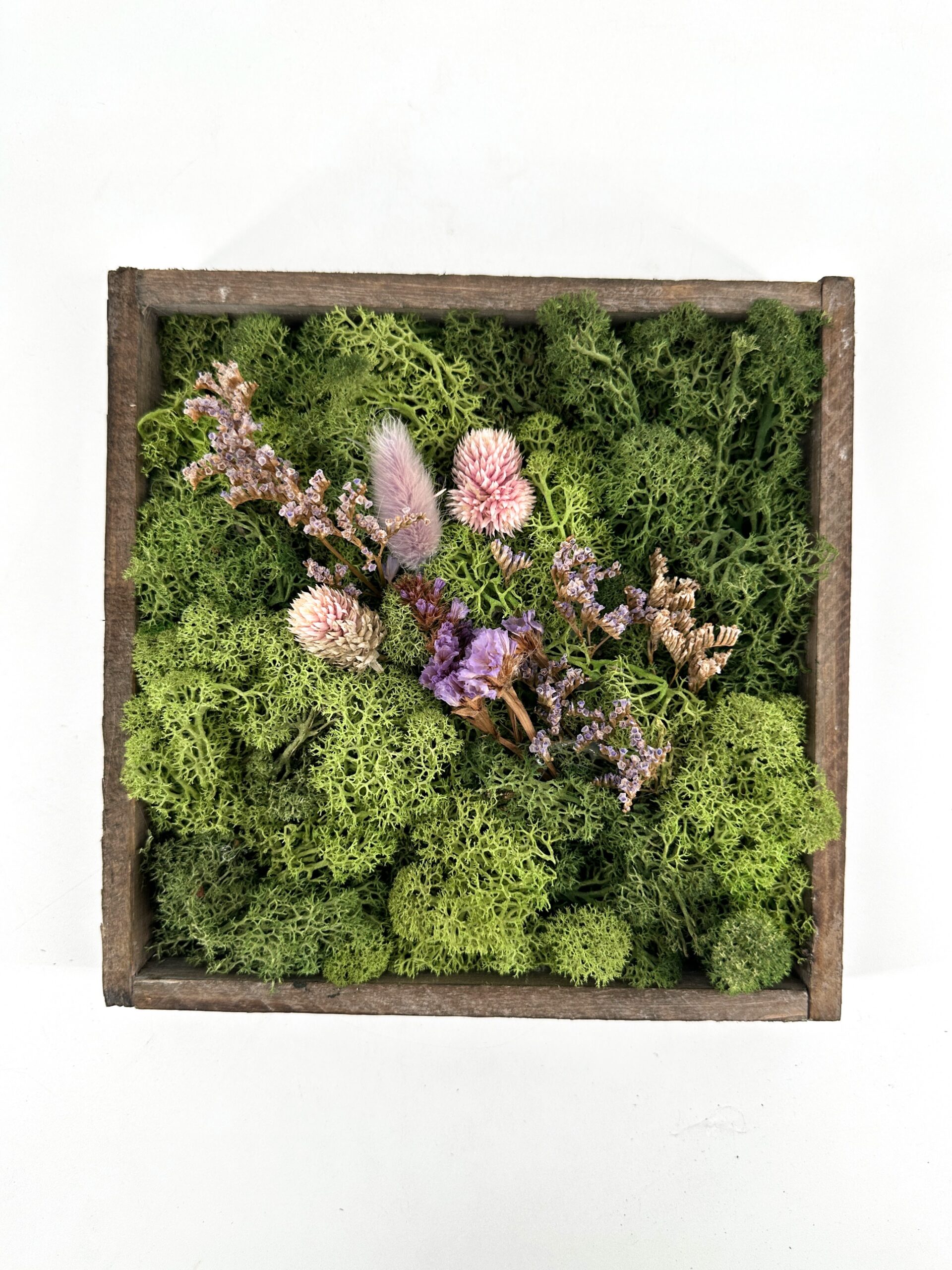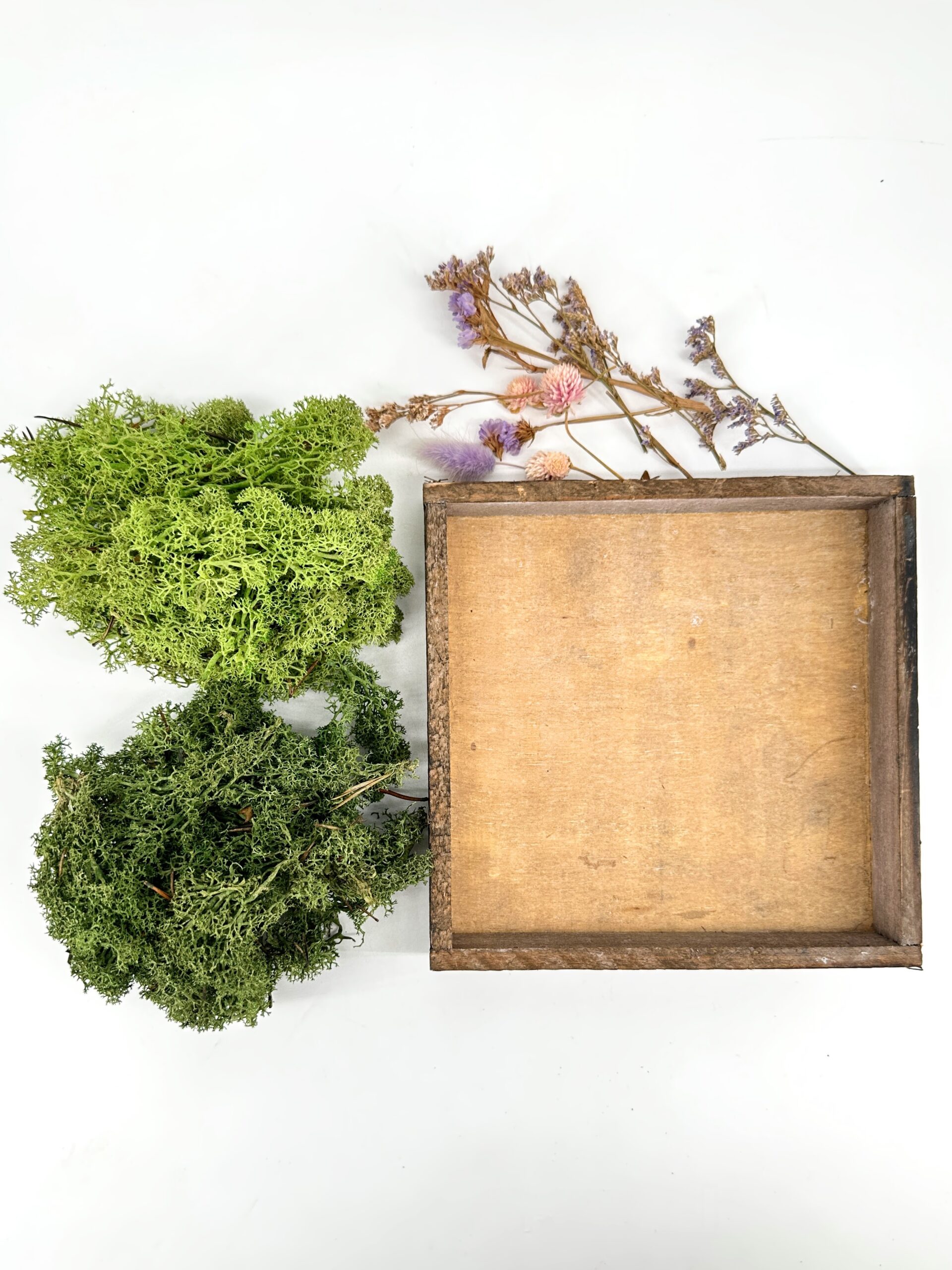 Each DIY kit includes a recycled wooden shadow-box frame, a mix of preserved reindeer moss in green shades, and dried flowers in lavender and pink hues. The amount, size, and variety of flowers may vary depending on our fresh seasonal stock, making every kit unique. With these natural components, you can create a heather field effect or something completely different – your imagination will guide the design.