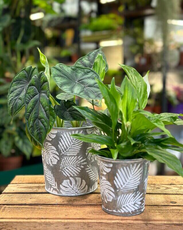 Vintage style, zinc planters with monstera, ferns and palms leaves design. Ideal for small, medium and large houseplants. Suitable also for herbs and other botanical projects. Planters do not have drainage hole.