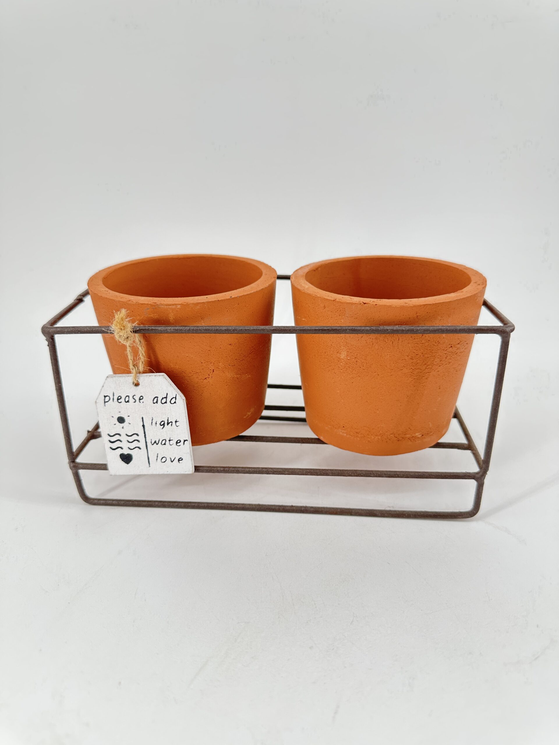Every pot includes a sweet tag reading “Please add light, water & love” – the perfect reminder for plant care. The terracotta finish and sturdy frame have a natural, slightly weathered look, with subtle variations and discolouration that give each piece a unique, rustic character. The frames themselves are sometimes a little wonky, adding to the lovely vintage-style finish that makes each set charmingly imperfect.