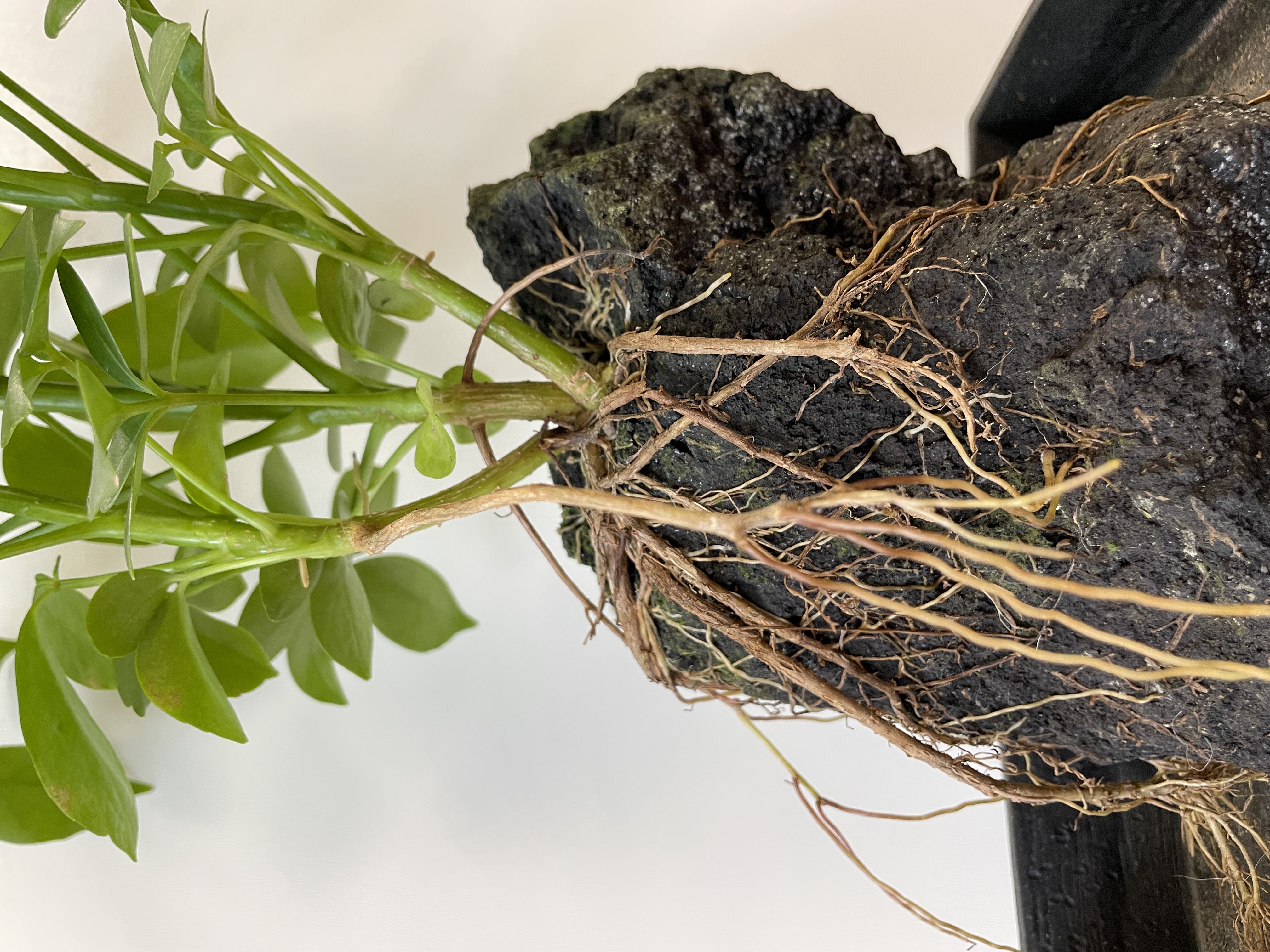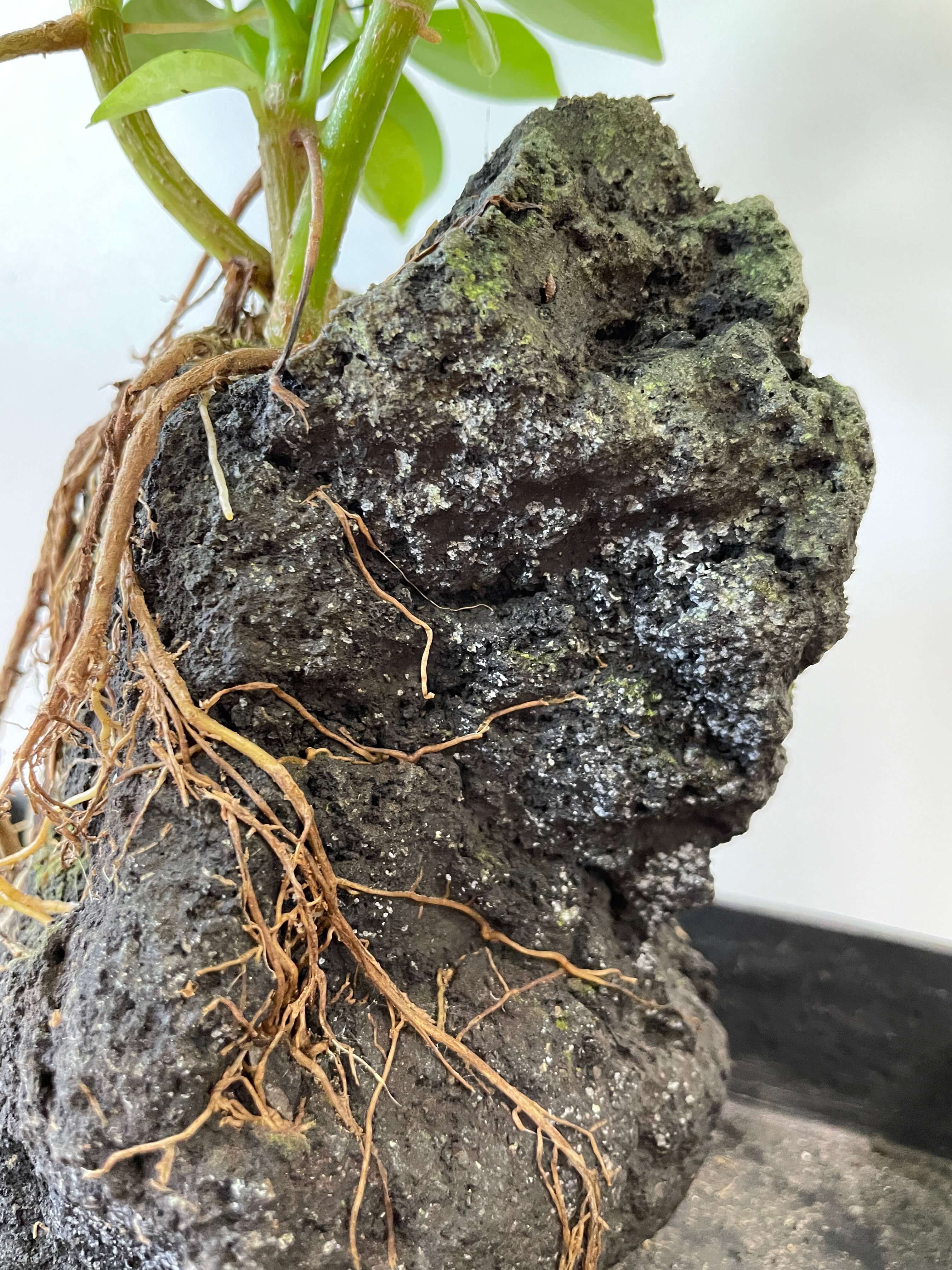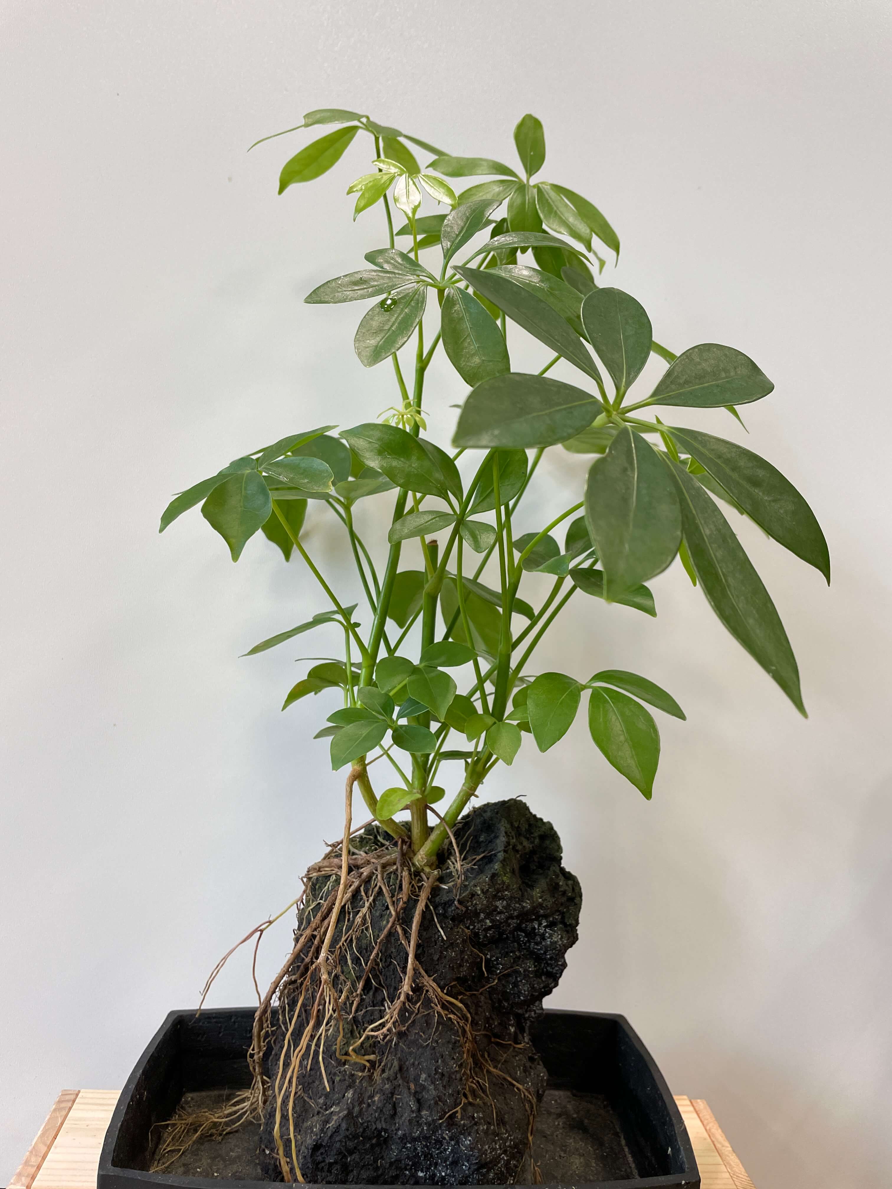 A great example of using a not-so-typical species as a Bonsai. Schefflera are much easier to keep as indoor plants and their care is far more predictable than other species used as houseplant Bonsai. Sat proudly at the top of a lava rock mountain this plant is a great display of its epiphytic capabilities.