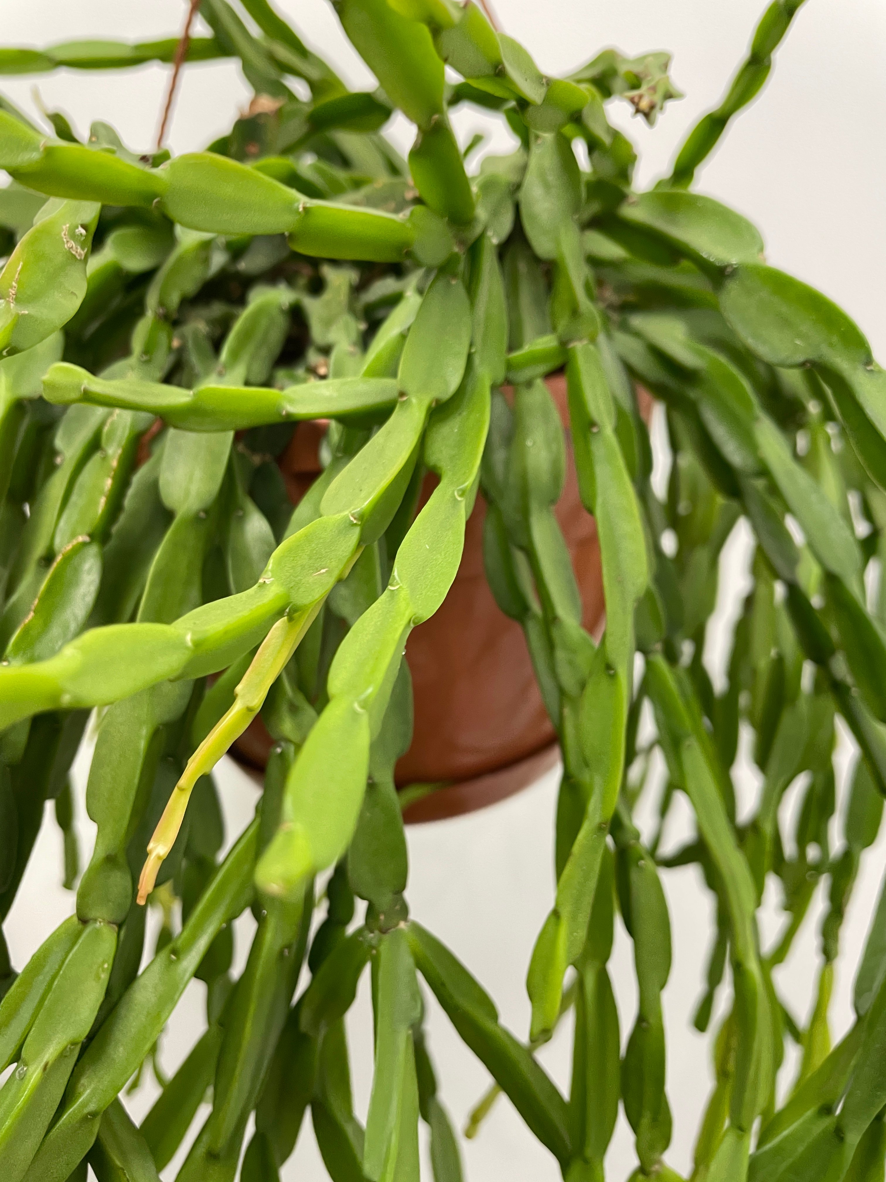 If in doubt it’s better to keep these plants on the drier side and they will often let you know if they are desperate for a drink. When they become dehydrated the tendrils start to lose their rigidity and the plant begins to droop and pucker, if left to dry out further often the tendril will start to turn brown and become crispy. But if your plant ever reaches this stage it’s not the end of the world. Rhipsalis are robust and forgiving and will soon bounce back once watered.