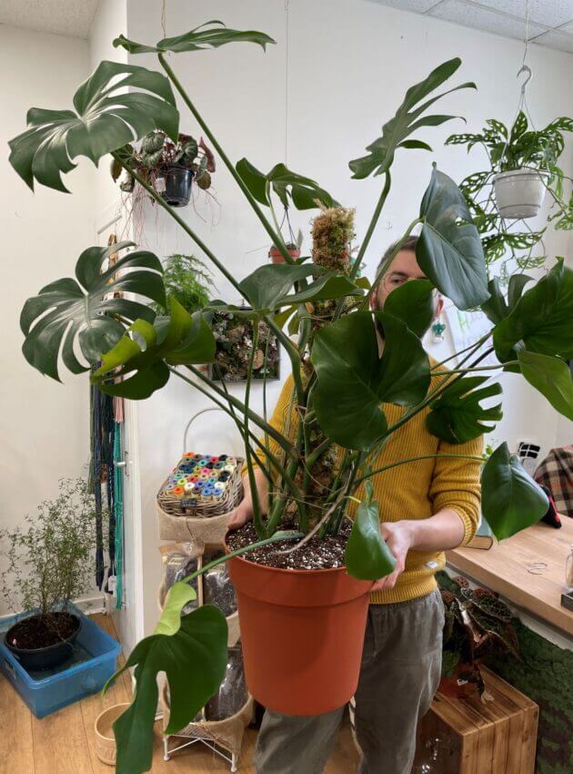 Beautiful large Monstera repotted into a bigger planter with hand-blended aroid potting mix and supported with a handmade, fresh sphagnum moss pole during our repotting session.