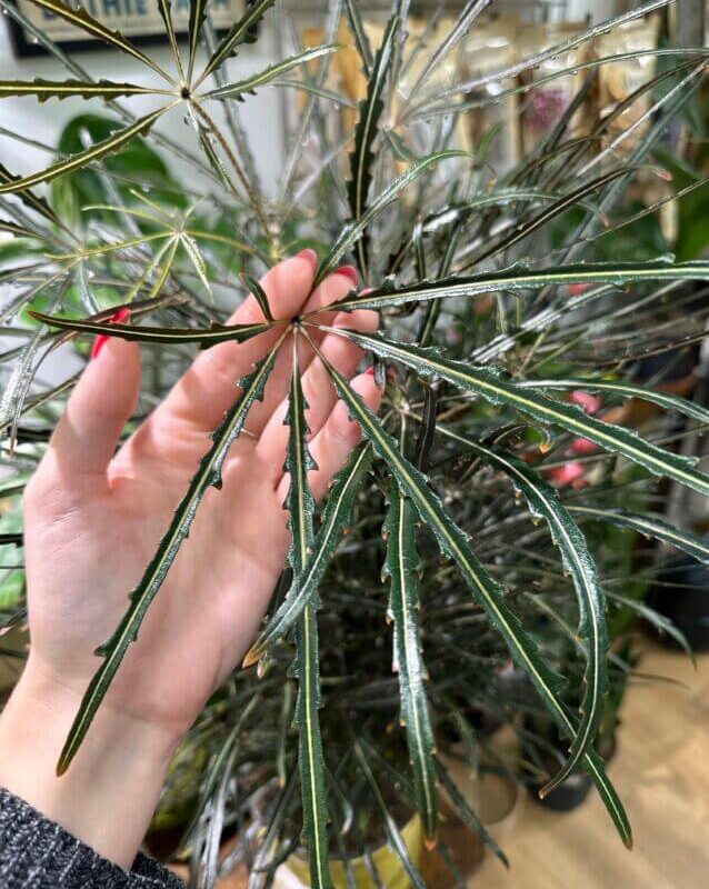 Dizygotheca Elegantissima, also known as spider aralia, purple spider plant or threadleaf aralia, is usually grown for its attractive foliage. This easy-to-care houseplant has long, narrow, dark green leaves in a dark purple (almost black!) colour with a shiny finish.