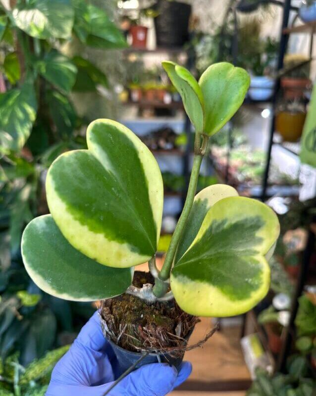 Your Variegated Hoya Kerrii will thrive in a well-lit area where it can enjoy bright, indirect sunlight. Too much direct sun might scorch the leaves, so dappled light is ideal. Lower light levels are okay but may reduce blooming.