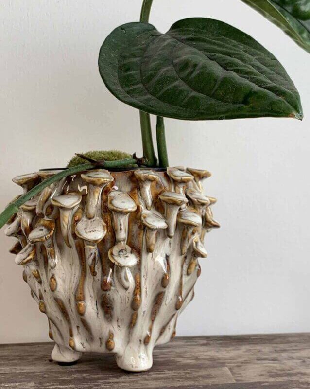 This is the most exquisite and extraordinary planter we think we have seen! She is in a lovely mix of brown colours with toadstool style designs coming out of the sides. It looks absolutely amazing – people will probably be more interested in the planter than the plant!