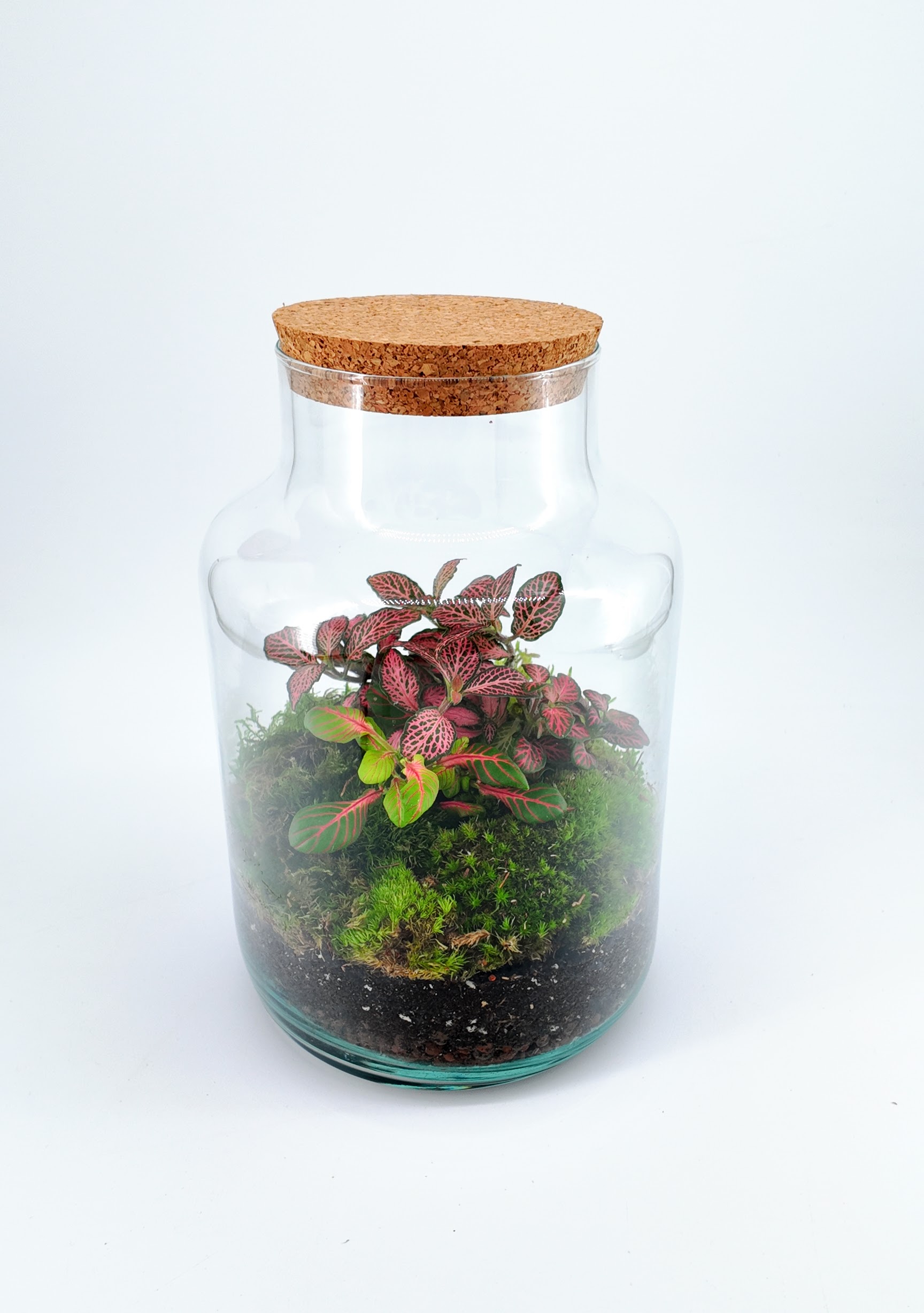 Each piece is unique, with natural variations in moss textures, plant colours and arrangement. Photos show examples; your Fittonia terrarium will include the same species but may feature white, red or pink foliage.